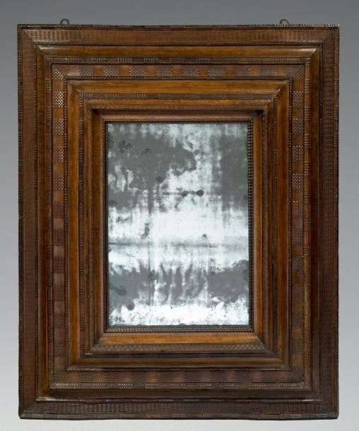 MIROIR Poirier H: 140 cm - l: 120 cm France - XVIIème siècle Très bel état, miroir ancien rapporté, crochets d'attache d'origine Ce miroir au grand cadre est caractéristique de l'époque Louis XIII. Il a conservé ses deux pattes de fer de fixation. Il alterne moulures et doucines avec des platebandes guillochées, d'un modèle à chaque fois différent. La platebande centrale anime l'ensemble avec des petits carrés guillochés alternant avec d'autres carrés plans.