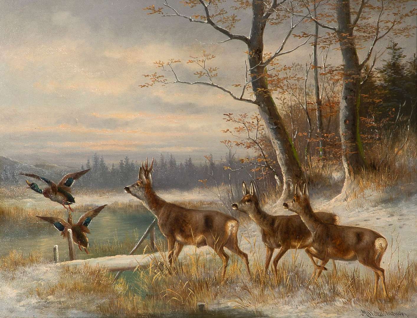 Paysage de neige aux chevreuils et colverts