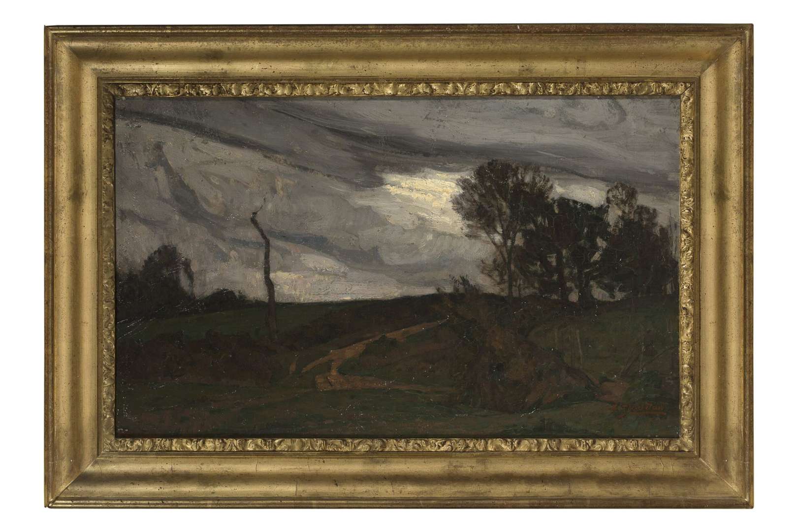 Oil on panel, signed lower right, inscribed 'Paysage des Dombes' on the reverse