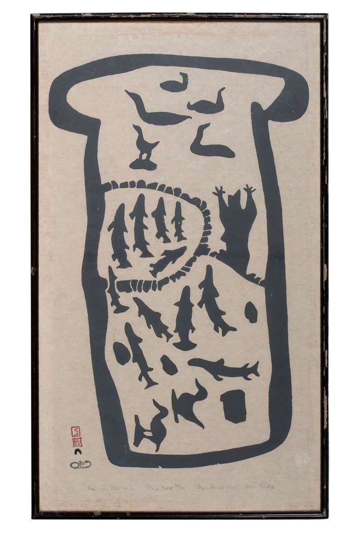 Stonecut on paper, signed, numbered of 50, dated '1961', titled and located 'Cape Dorset' lower middle