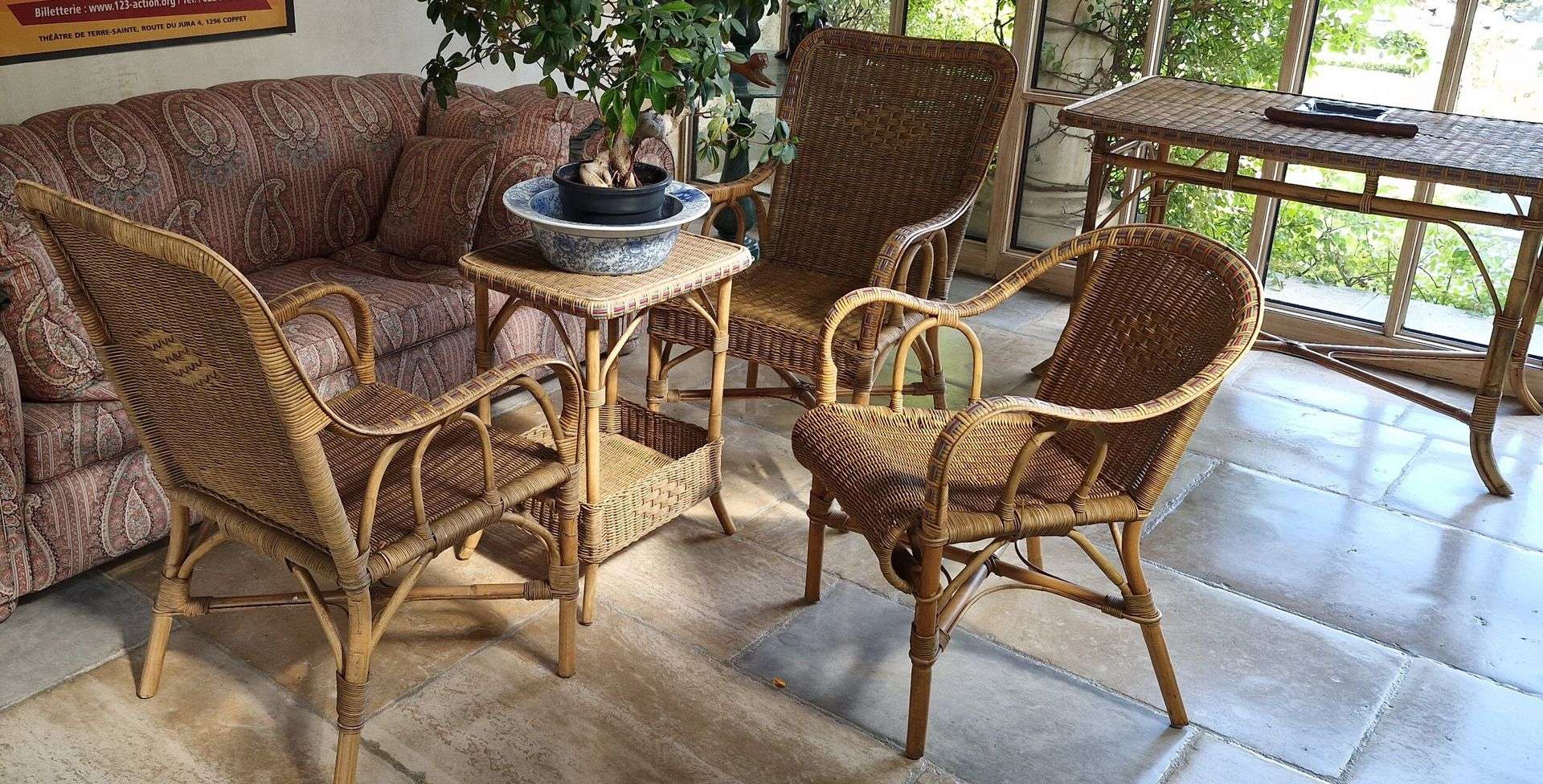 rectificatif: Mobilier de jardin en rotin comprenant une table rectangulaire, deux petites tables d'appoint, deux grands fauteuils , deux petits fauteuils, deux guéridons, un canapé et une jardinière