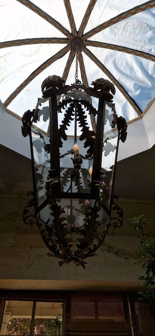 Paire de lanternes en fer forgé et tôle peinte à trois lumières
