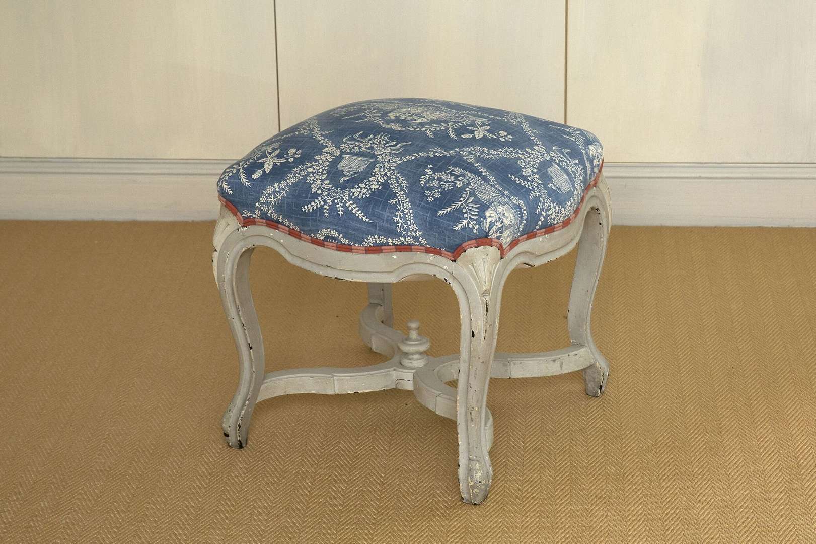 Tabouret en bois sculpté et peint, piétement à entretoise.