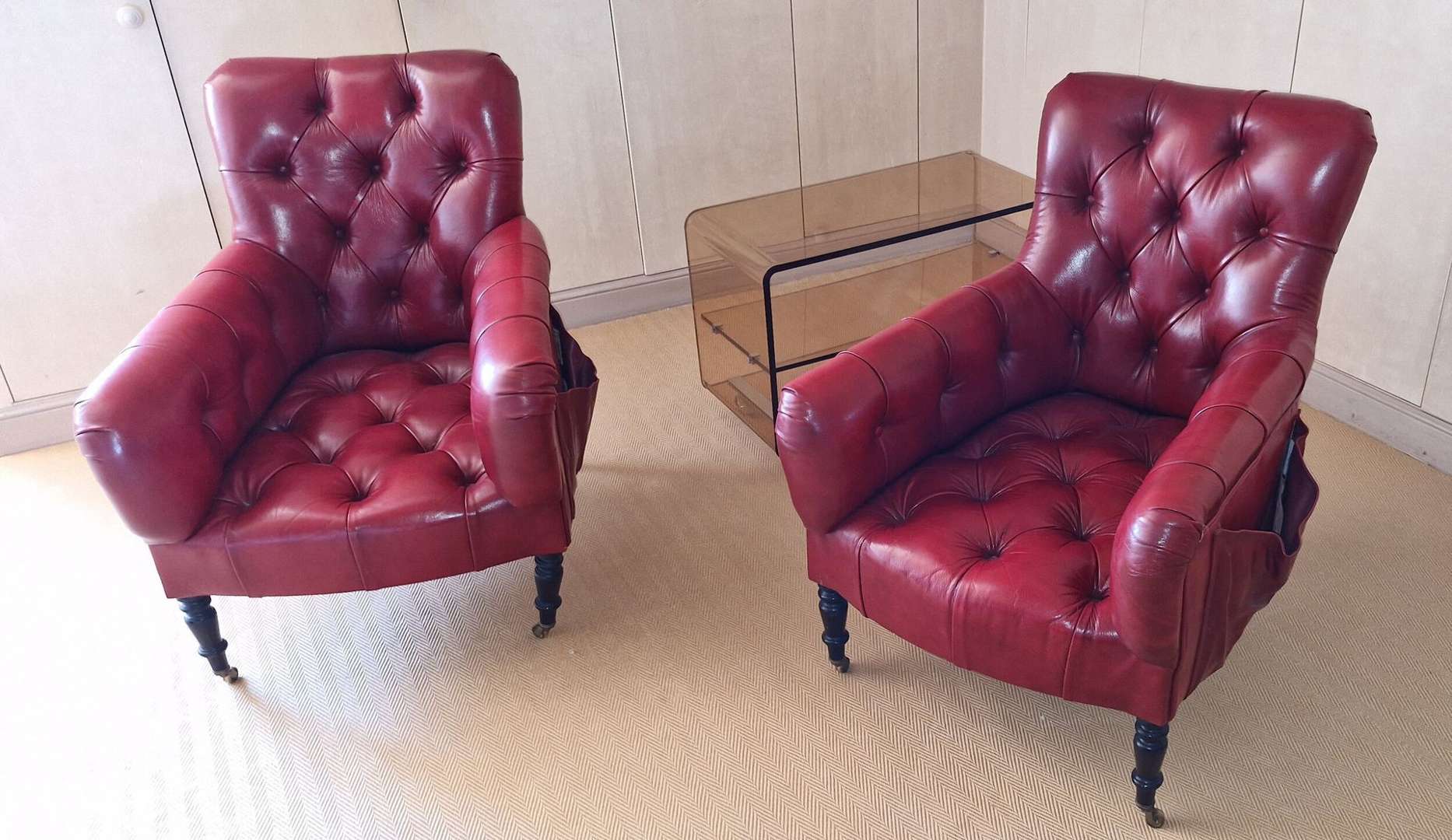 Paire de fauteuils Chesterfield en cuir rouge, pieds toupie.