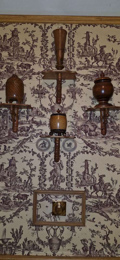 Suite de six consoles d'appliques en bois et divers objets décoratifs en bois sculptés tels que tonneaux, verres, en ensemble de vide-poches