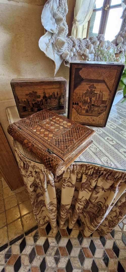 Trois boites en marqueterie de paille à décor d'un village dont une en for