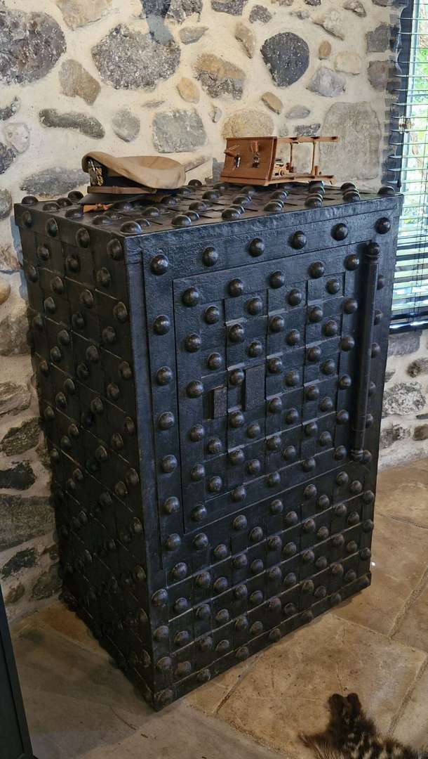 Coffre-fort en fer , décorations de clous et bandes de fer.