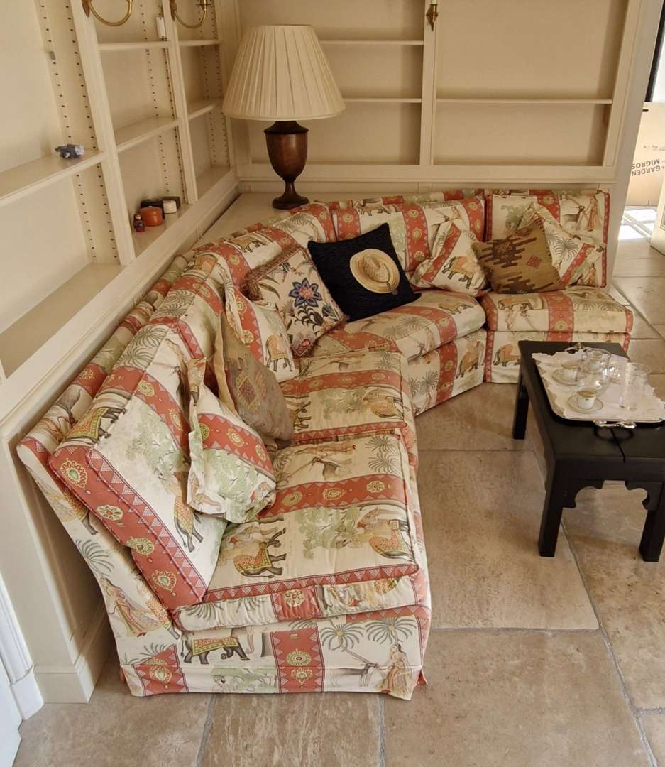 Canapé d'angle cinq places en tissu à décor d'éléphants et personnages.