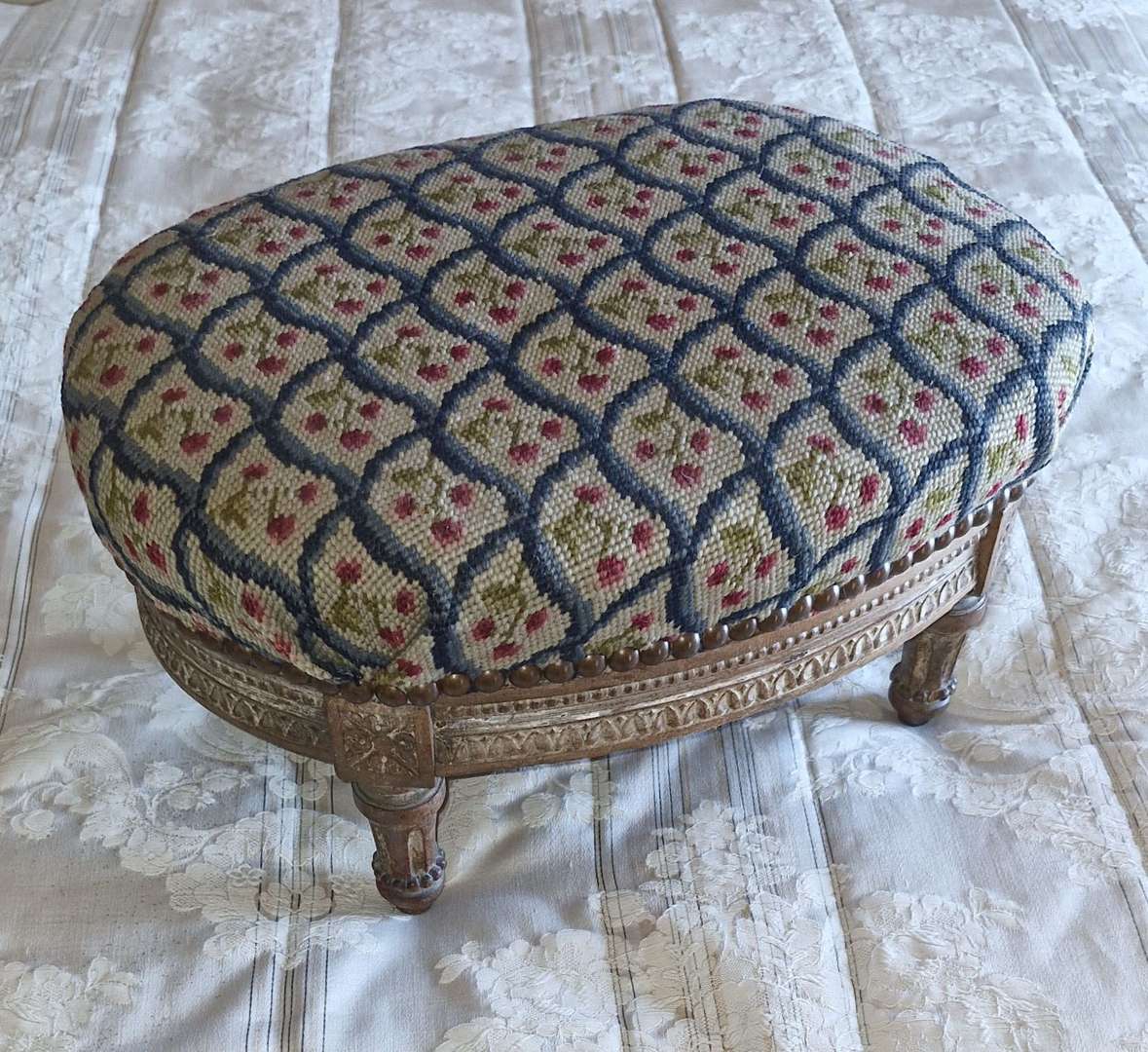 Repose-pied en bois sculpté et peint