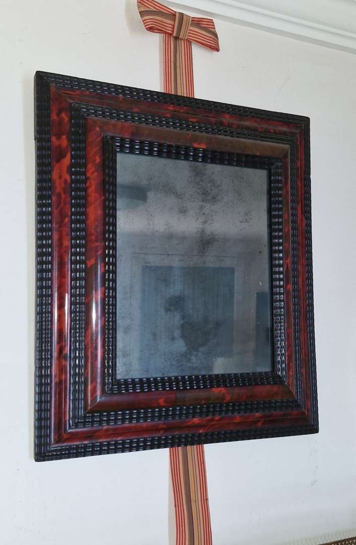 Miroir à encadrement et bois noirci et écailles rouge.
