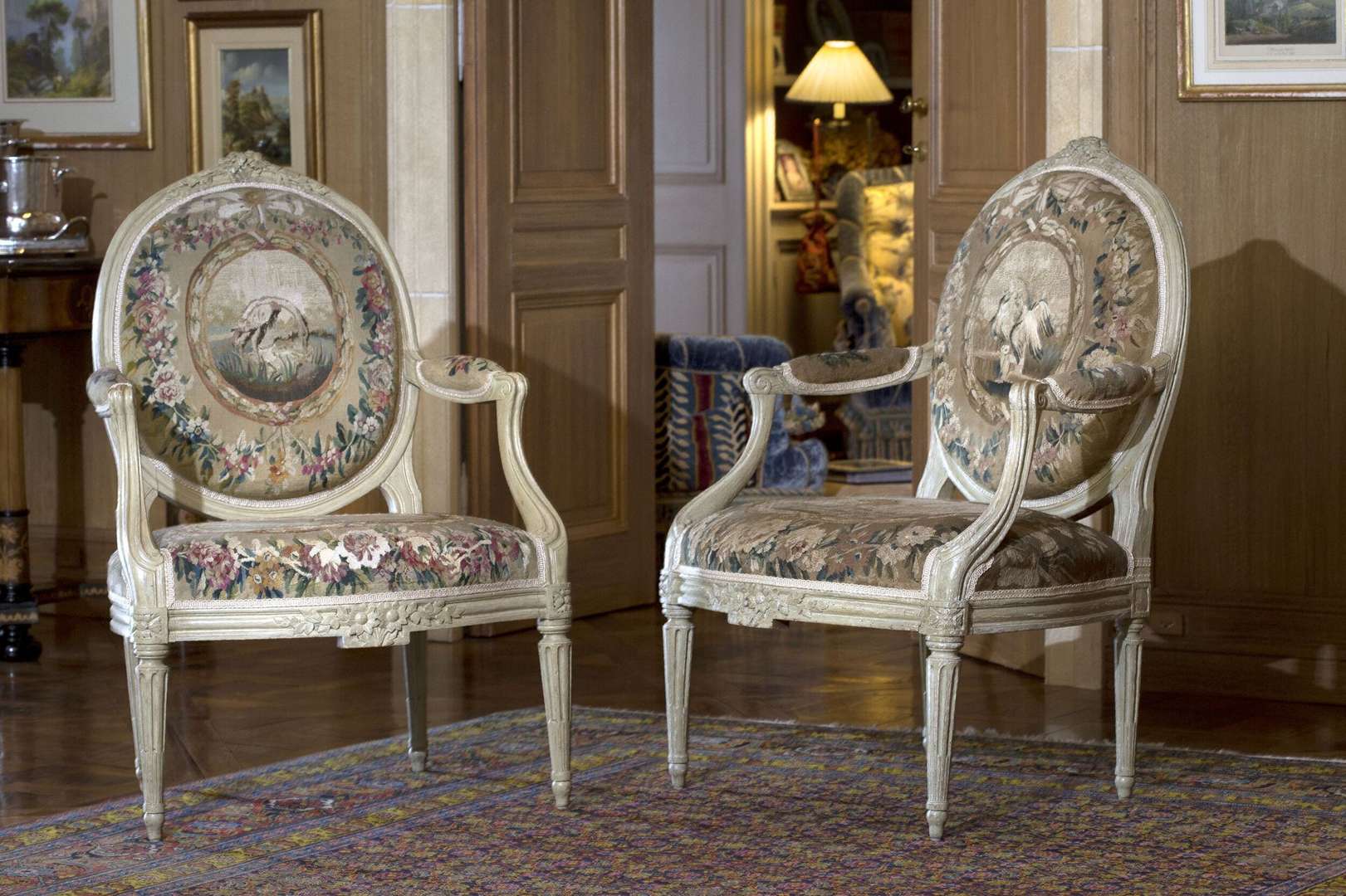 ERRATUM // Ensemble de salon comprenant un canapé et six fauteuils à dossier médaillon en bois sculpté de fleurs et laqué blanc reposant sur un piétement à cannelures rudentées.