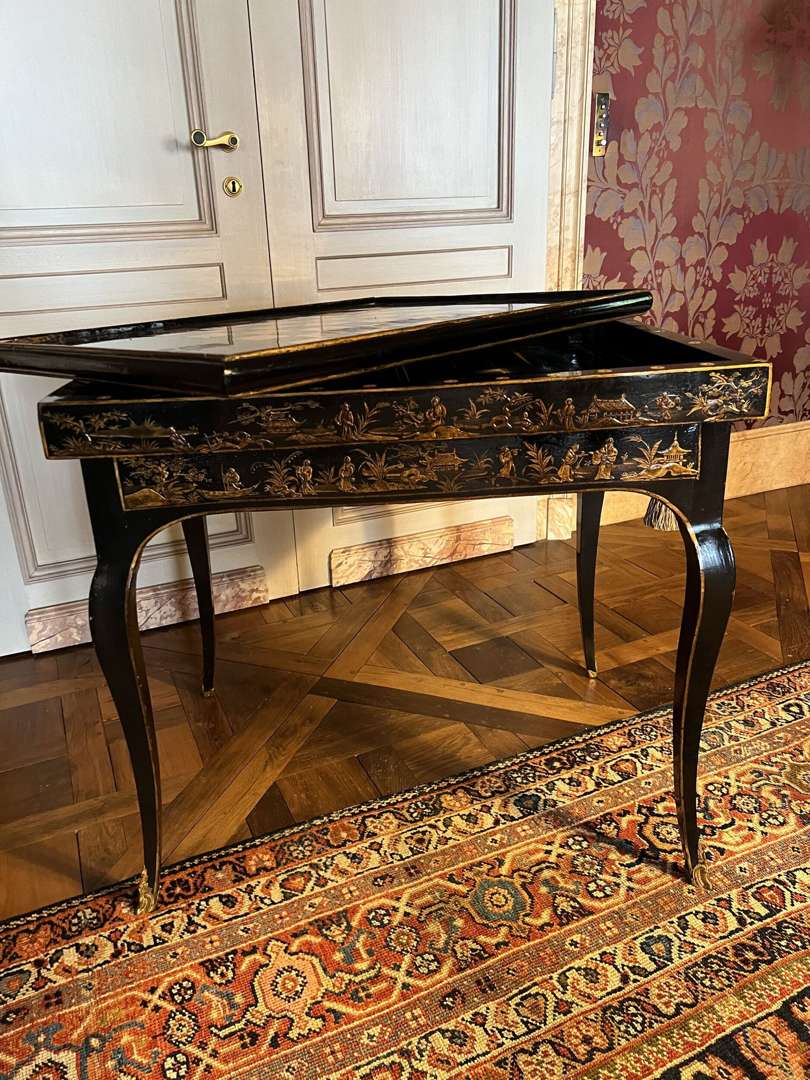 Table tric-trac en bois laqué noir et or à décor peint à la chinoise, le plateau pivotant à revers à damier, ouvrant par deux tiroirs et tirettes sur les côtés.