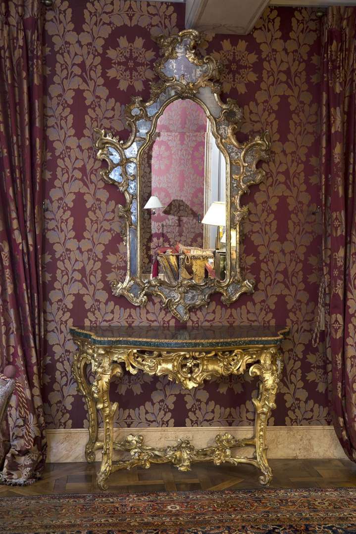 Belle paire de consoles en bois doré richement sculpté, les pieds réunis
