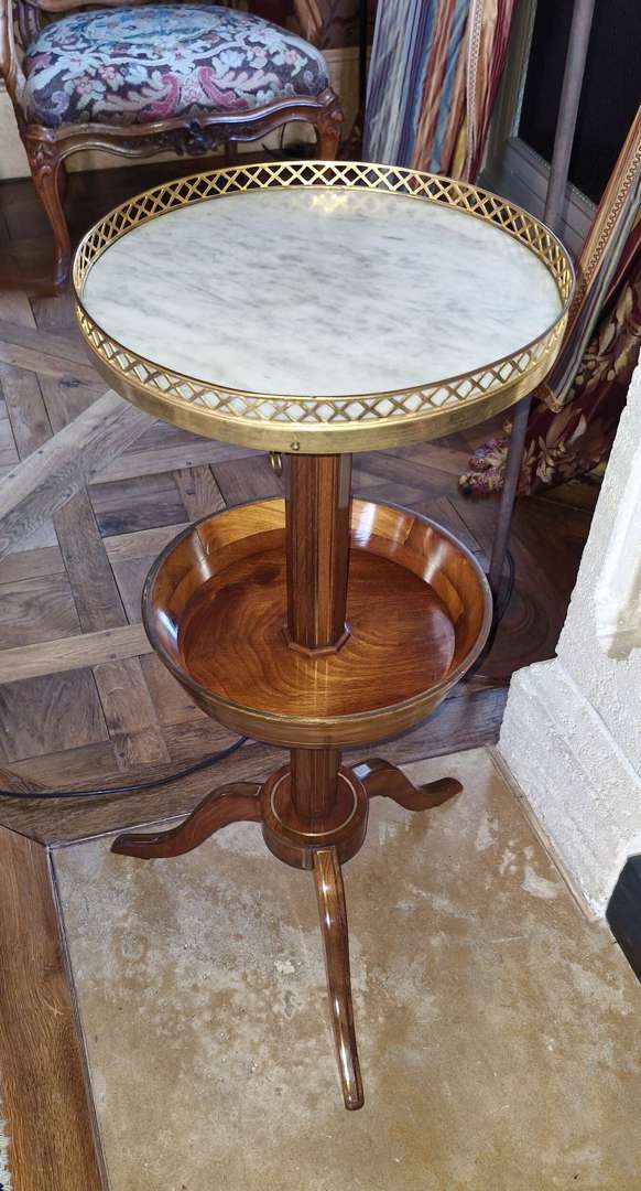 Selette à crémaillère en acajou et filets de laiton, à deux plateaux circu