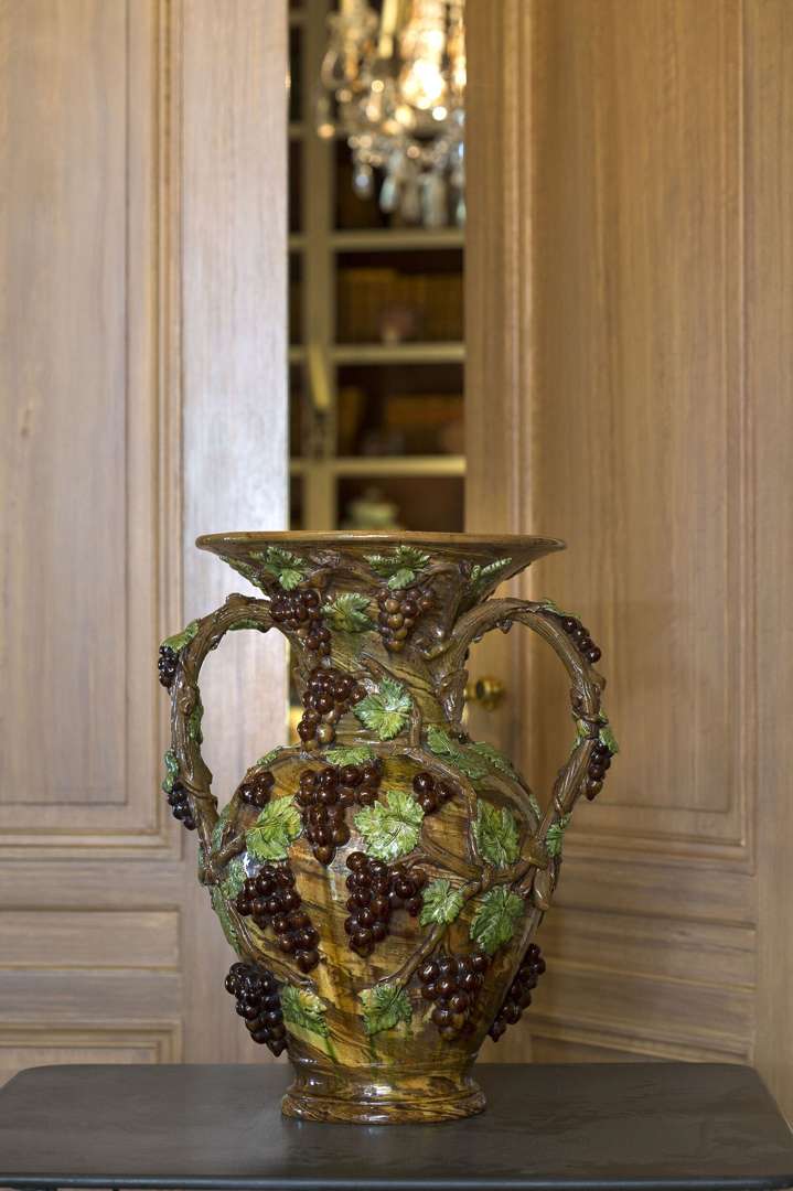 Paire de grands vases à piédouche en terre vernissée à décor de grappes de raisins en relief