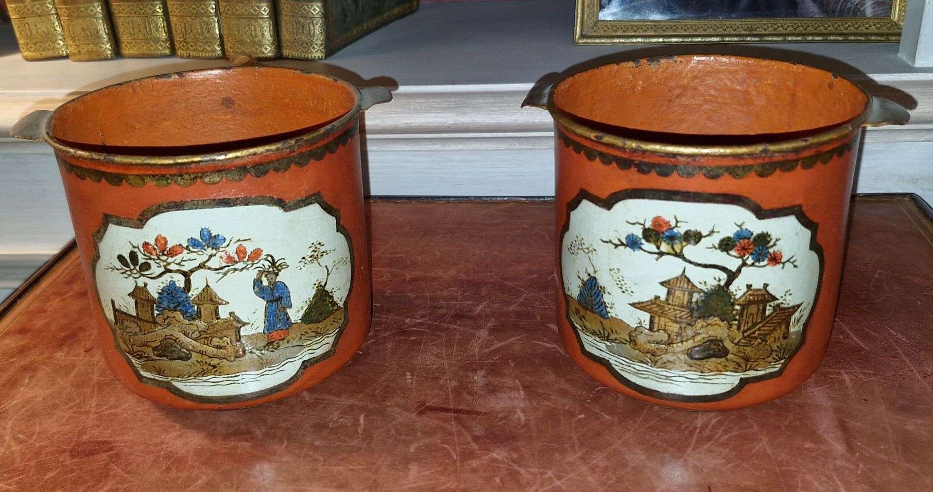 Paire de petits cache-pots en tôle à décor de chinoiseries.