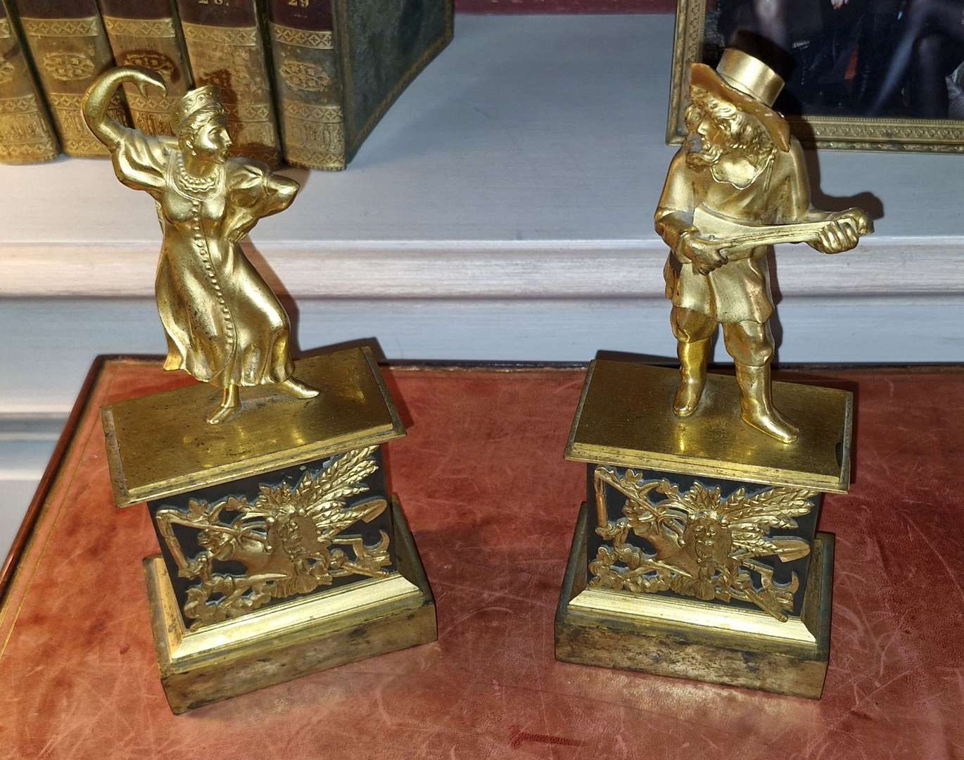 Paire de personnages en bronze à deux patines représentant une danseuse et un musicien.