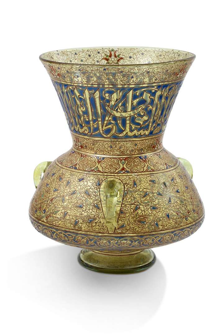 Vase lampe de mosquée, de forme balustre à haut col évasé, en verre fumé transparent, à décor émaillé polychrome, d'inscriptions eulogiques mameloukes en arabe en écriture thuluth : "izz li-mawlana al-sultan al-malik al-‘alim al-‘adil al-malik Naser ´izz nasrahu" (Gloire à notre Maître le Sultan le Roi savant et juste al-Malik al-Nasir que sa victoire soit glorieuse !) sur le col, frises de fleurs et d'entrelacs, fond de fleurs stylisées, le corps orné de trois anses appliquées à chaud.