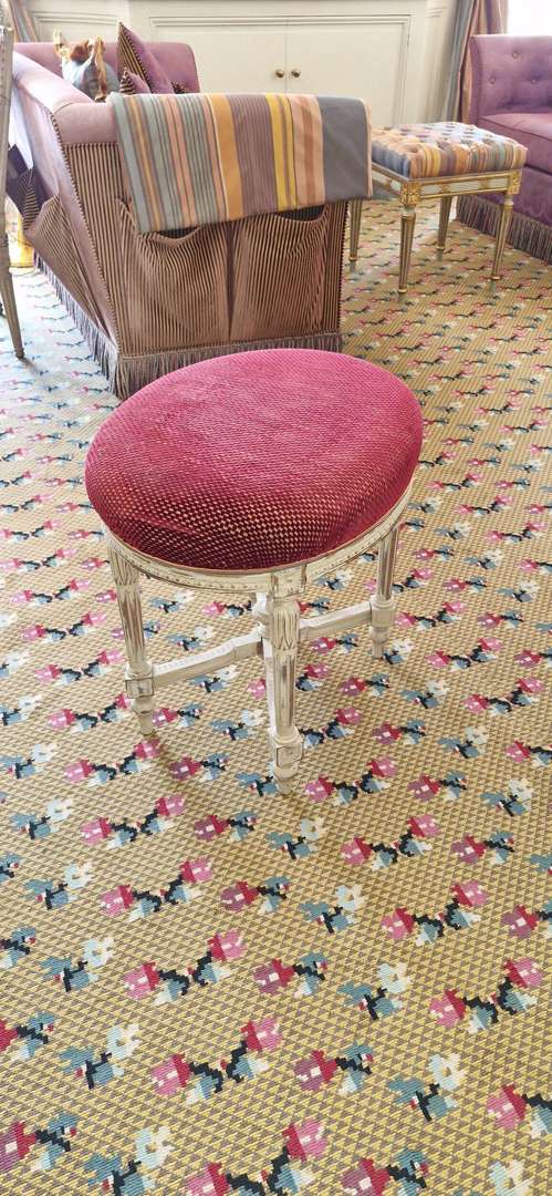 Tabouret en bois mouluré et peint blanc, garniture de velours rouge.