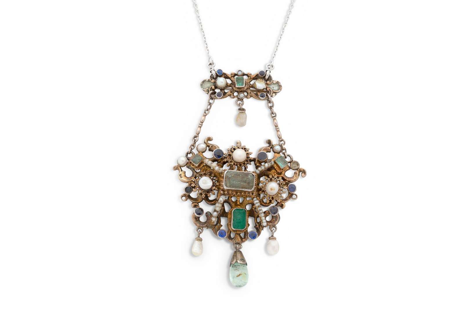 Soufflures de perles, saphirs et aigue-marine en pampille