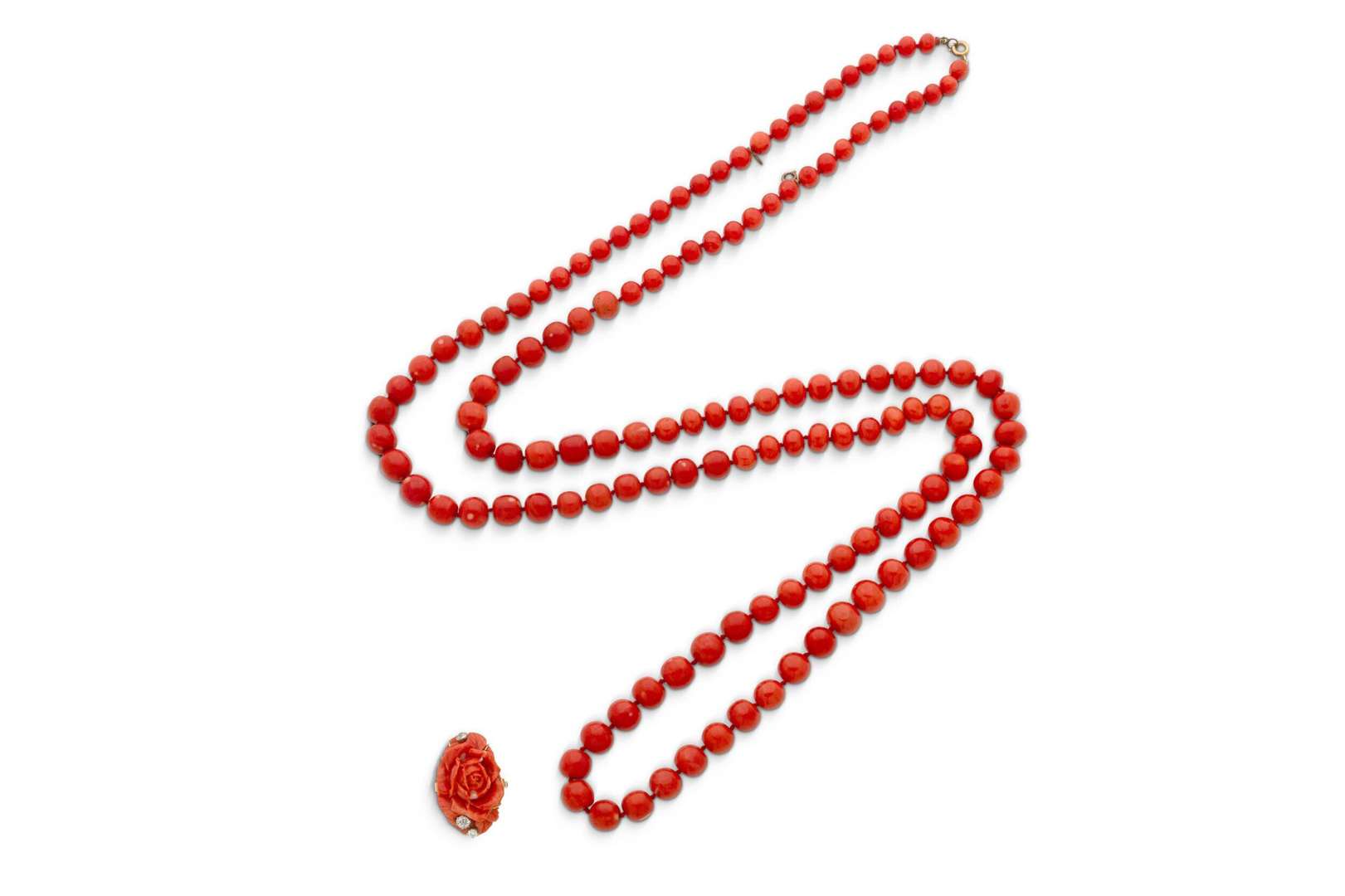 Collier de 133 perles de corail et bague en corail gravé et diamants taille ancienne