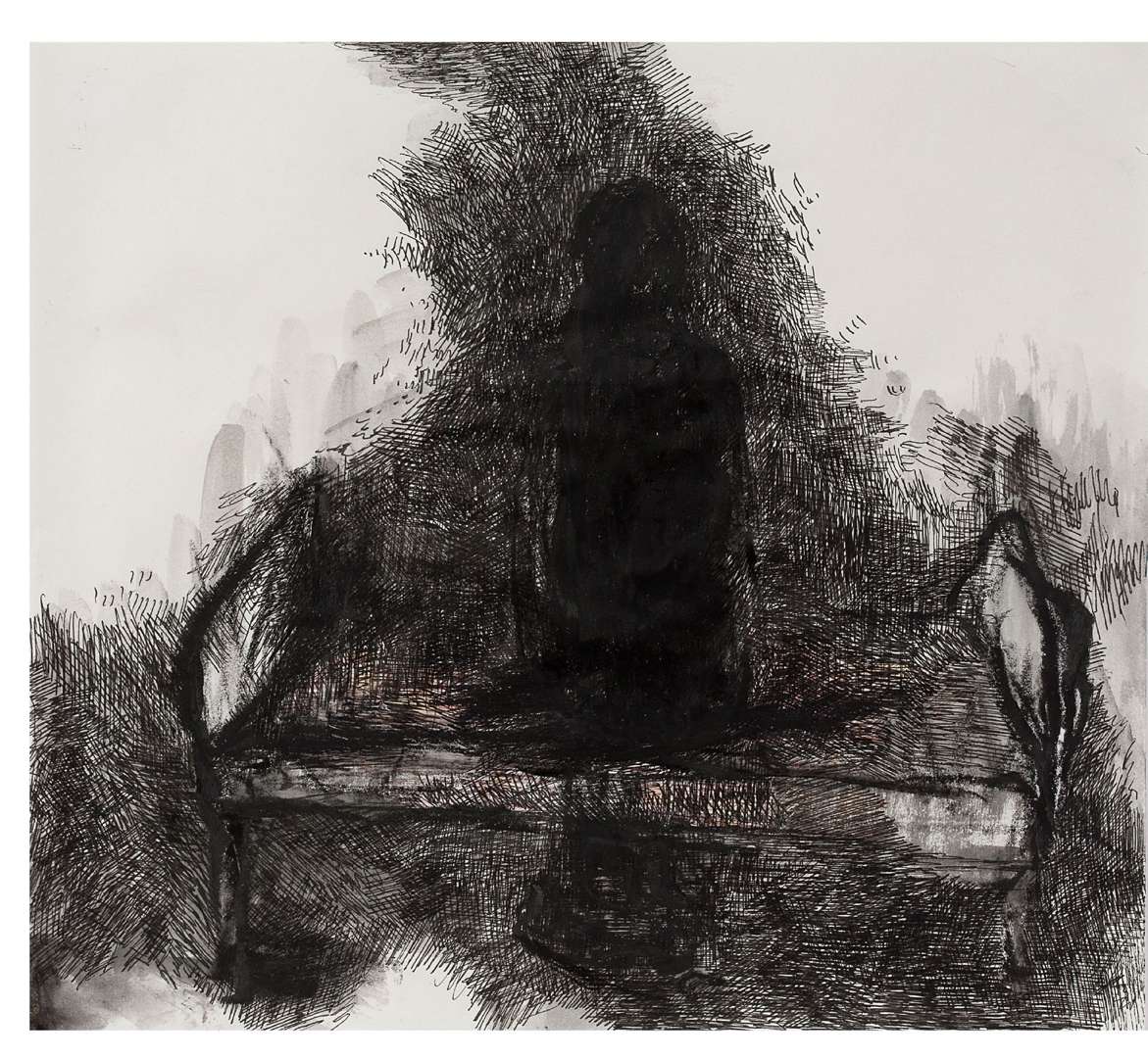 Cette encre sur papier est un rare autoportrait présumé, une approche qu’elle a explorée à travers différents médiums. L’artiste y est représentée assise de dos sur un lit, dans une posture à la fois introspective et énigmatique. L’esquisse au trait noir, rapide et expressive, donne une impression de fragilité et d’impermanence, tandis que l’arrière-plan est marqué par une touche de rouge en lavis, ajoutant une dimension dramatique et émotionnelle à la scène. Le lit, chez Shiota, est un symbole puissant. Il incarne un espace de transition : entre le sommeil et l’éveil, la vie et la mort, la mémoire et l’oubli. Ce motif apparaît dans plusieurs de ses installations majeures, comme During Sleep (2000), où un lit est entièrement recouvert de fils noirs, ou encore In Silence (2003), où un piano calciné est pris dans un enchevêtrement de fils tendus. En 2004, année de création de cette oeuvre, l’artiste connaît une montée en reconnaissance, exposant notamment en Allemagne, où elle vit et travaille depuis plusieurs années.