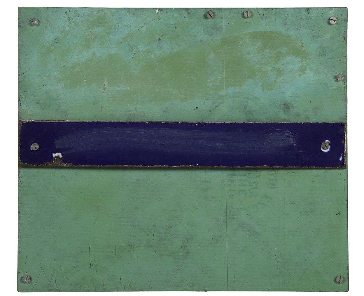 Enamelled metal sheet screwed onto wooden panel, signed, dated and titled on the reverse
