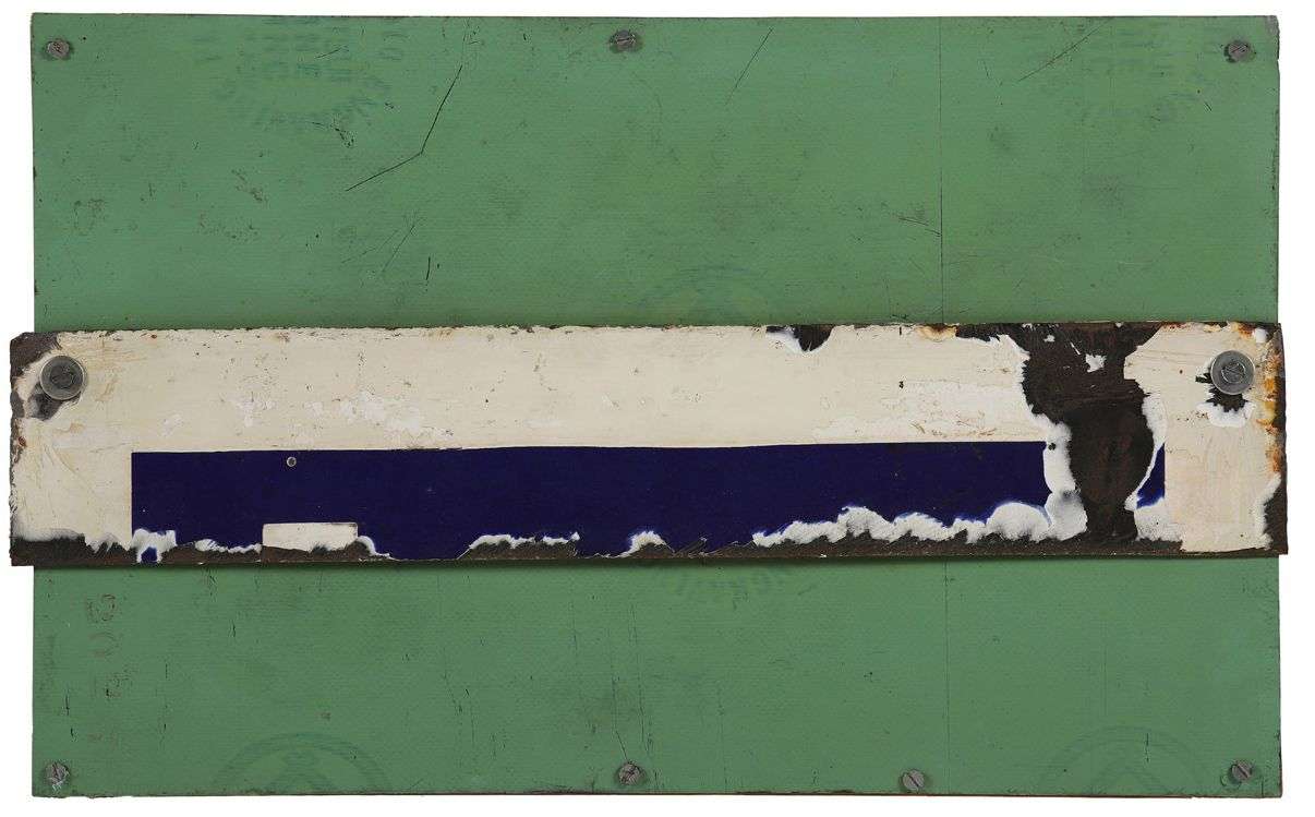 Enamelled metal sheet screwed onto wooden frame, signed, dated and titled on the reverse