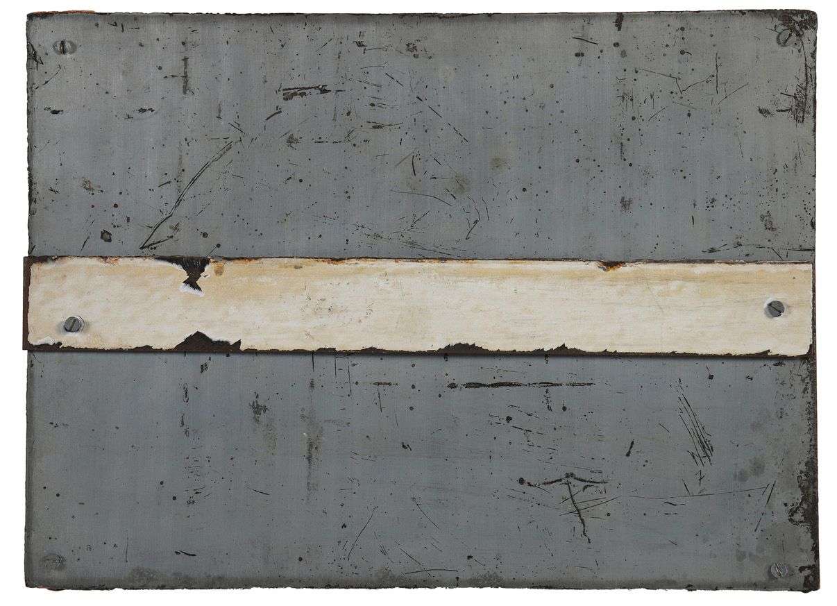Enamelled metal sheet screwed onto wooden frame, signed, dated and titled on the reverse