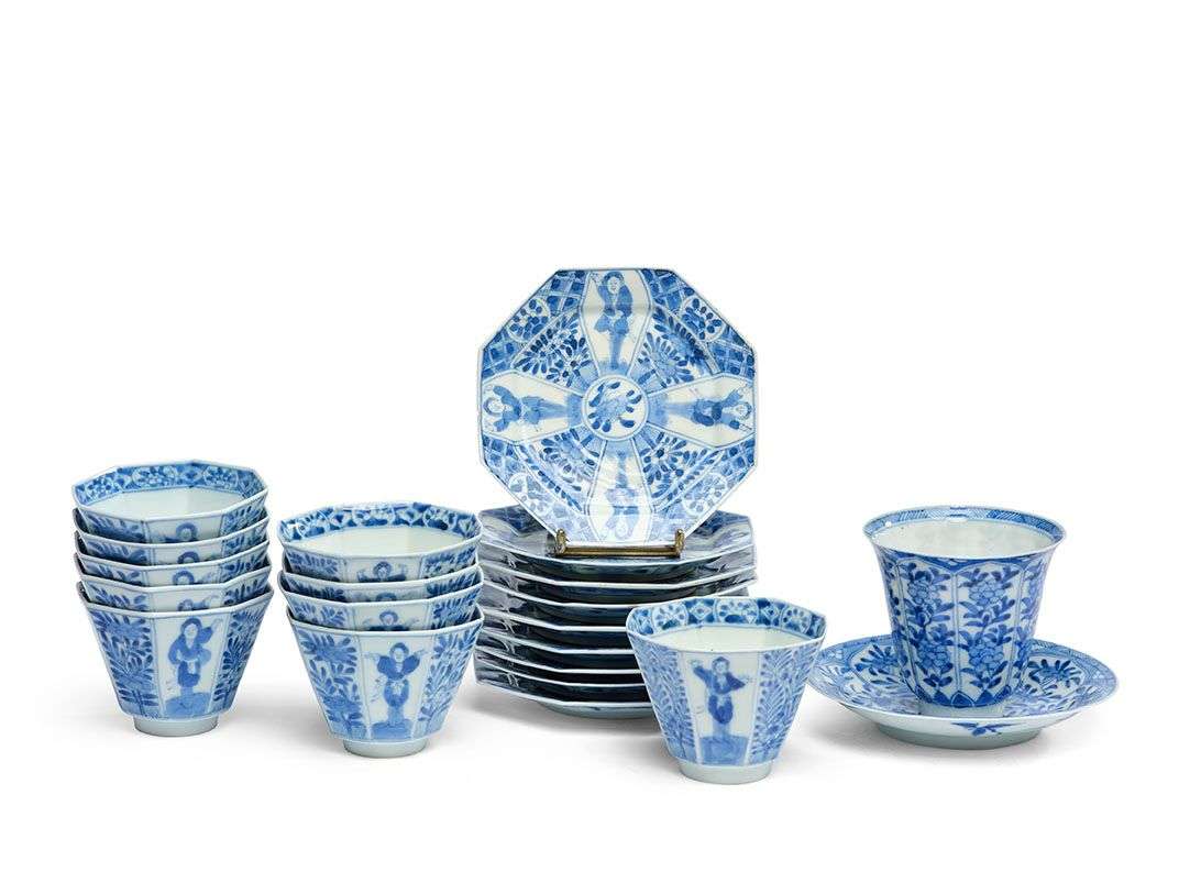 Ensemble de dix tasses et neuf soucoupes octogonales en porcelaine bleu-blanc à décor de danseurs et tiges fleuries dans le style de la période Kangxi. La base avec une marque à six caractères.