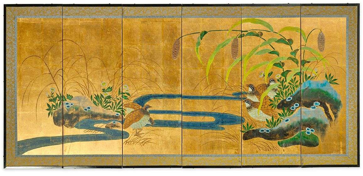 Petit paravent à six feuilles décoré à l'encre et couleurs sur papier figurant des cailles parmi les millets. L'ensemble se détachant sur un fond doré. La monture en bois laqué noir.