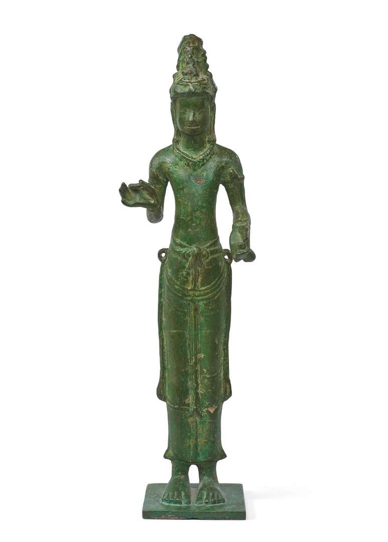 Le bodhisattva, au canon élancé, représenté debout sur une base carrée, une main en vitarka mudra, l'autre tenant un flacon à eau lustrale. Le chevelure relevée en un haut chignon avec un diadème abritant une effigie du bouddha Amithaba. Le bronze avec une belle patine verte.
