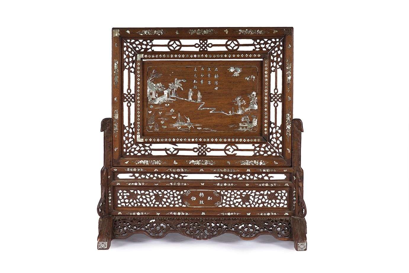 Important écran de table en bois naturel et incrustations de nacre, le centre orné de deux lettrés dans un paysage lacustre sous un poème, la structure ajourée à décor de rinceaux, motifs auspicieux, et incrustée de pampres et papillons.