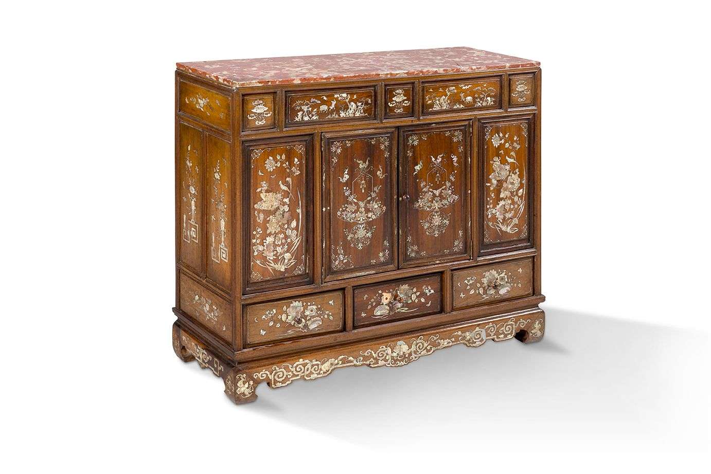 Le dessus avec un marbre griotte. Le meuble reposant sur un piétement postérieur de style européen.