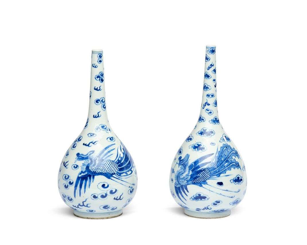 Deux bouteilles en porcelaine bleu-blanc à décor de phénix parmi les nuées. La base avec une marque Noi Phu.