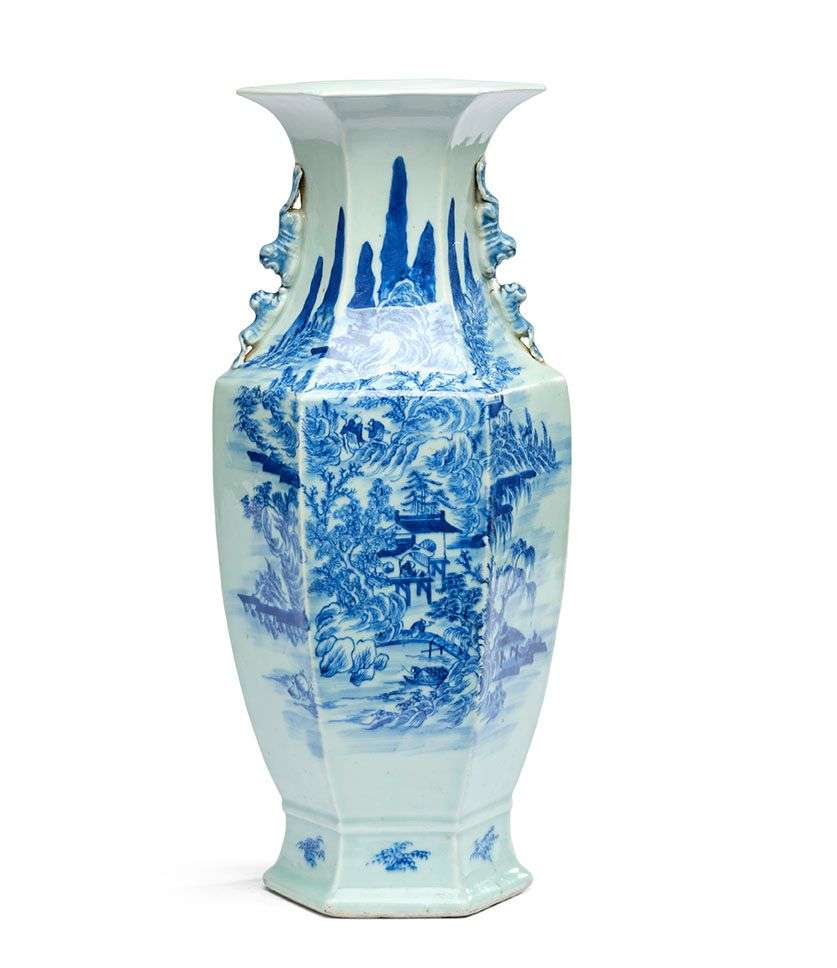 Vase en porcelaine bleu-blanc à décor de montagnes et paysages lacustres peuplés de pavillons et personnages.