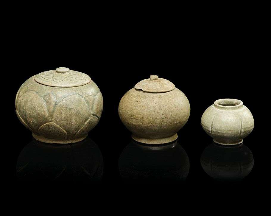 Ensemble en grès à couverte de type Yue comprenant une petite jarre polylobée, une jarre couverte et une jarre couverte à décor incisé de pétales de lotus.