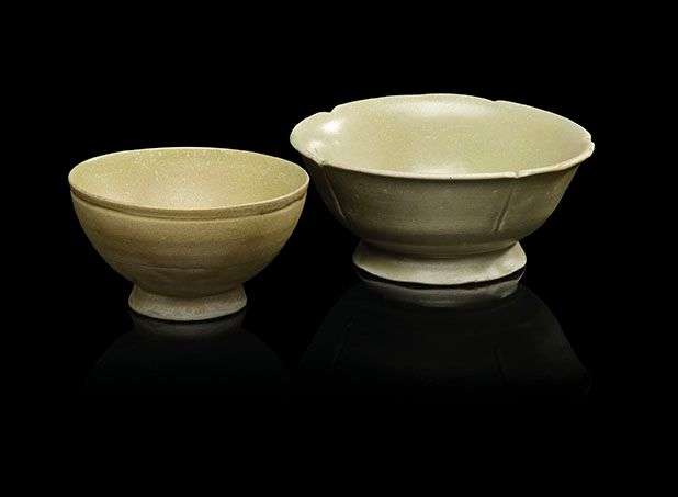 Ensemble en grès à couverte de type Yue comprenant un rince-pinceaux évasé polylobé et une petite coupe.