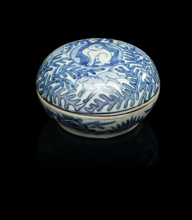 Boîte couverte circulaire en porcelaine bleu-blanc, le couvercle décoré au centre d'un lièvre, entouré de chevaux galopant dans les végétaux. Fours de la région de Zhangzhou (Swatow).