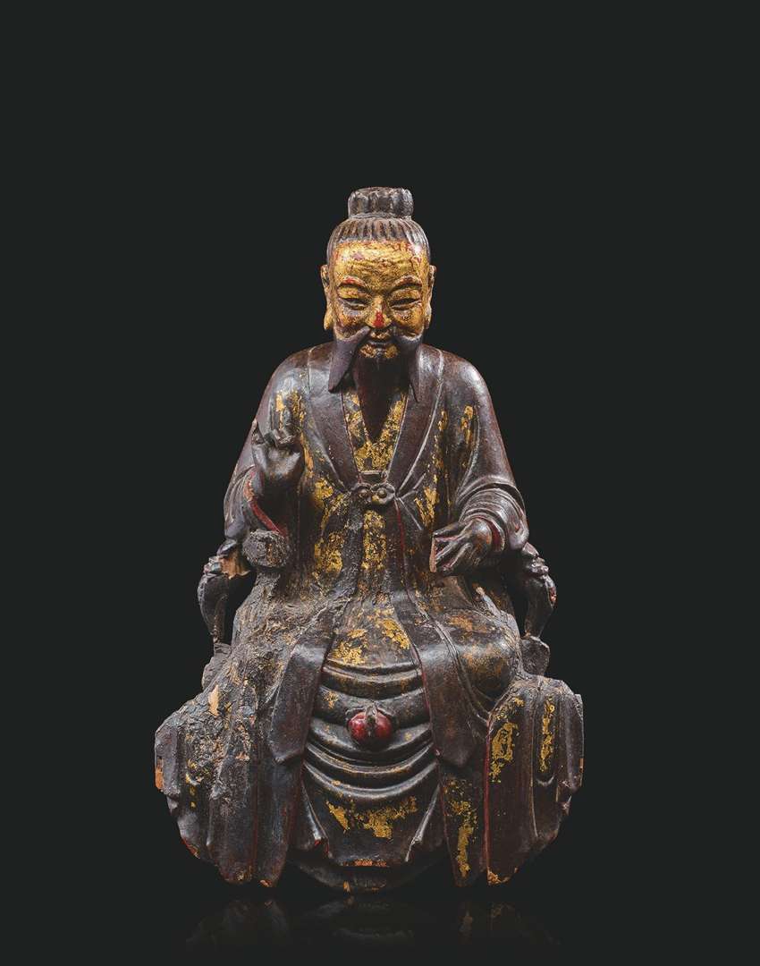 Statue de Daode Tianzun (« Le Vénérable céleste de la Voie et de sa Vertu ») en bois sculpté partiellement doré et polychromé.