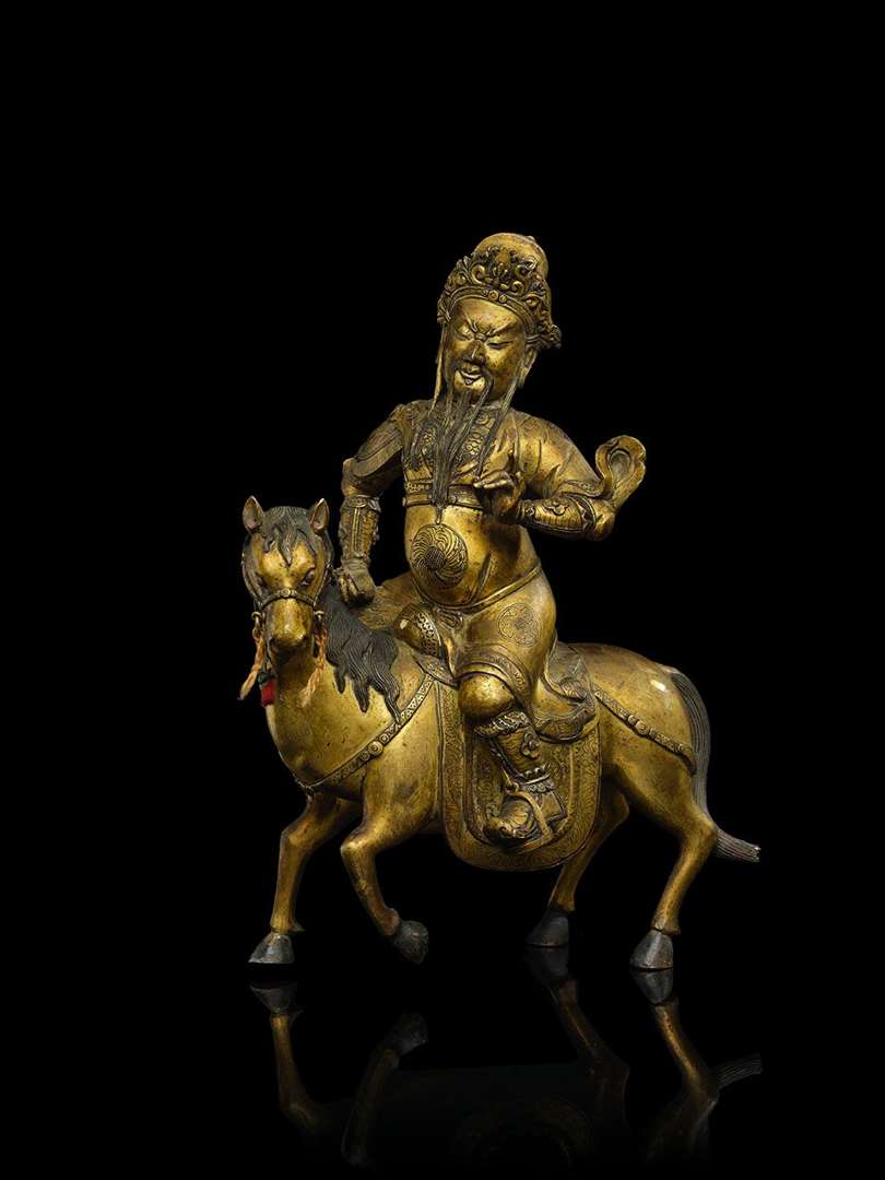 Statue de Guandi en bronze doré, figurant le général sur son cheval, vêtu d'une cuirasse rehaussée de larges écailles et d'une robe aux manches flottantes, le visage à l'expression sévère encadré par une longue barbe, la chevelure coiffée d'un bonnet à ailettes et rehaussée d'une couronne.
