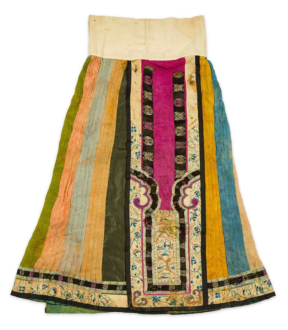Ensemble de deux jupes (mang qun), l'une en damas turquoise à fond décoré de fleurs stylisées, les panneaux principaux brodés aux fils de soie polychromes de fleurs.
