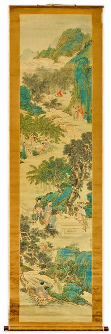 Peinture à l'encre et couleurs sur soie montée en rouleau vertical figurant des lettrés et leurs attendants s'adonnant à la peinture, calligraphie et devisant dans la montagne.