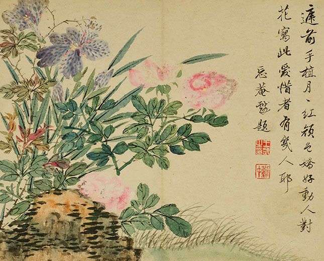 Ensemble deux feuilles d'album, l'une à l'encre et couleurs sur papier orné de fleurs parmi les rochers, l'autre à l'encre et couleurs sur soie figurant une résidence.