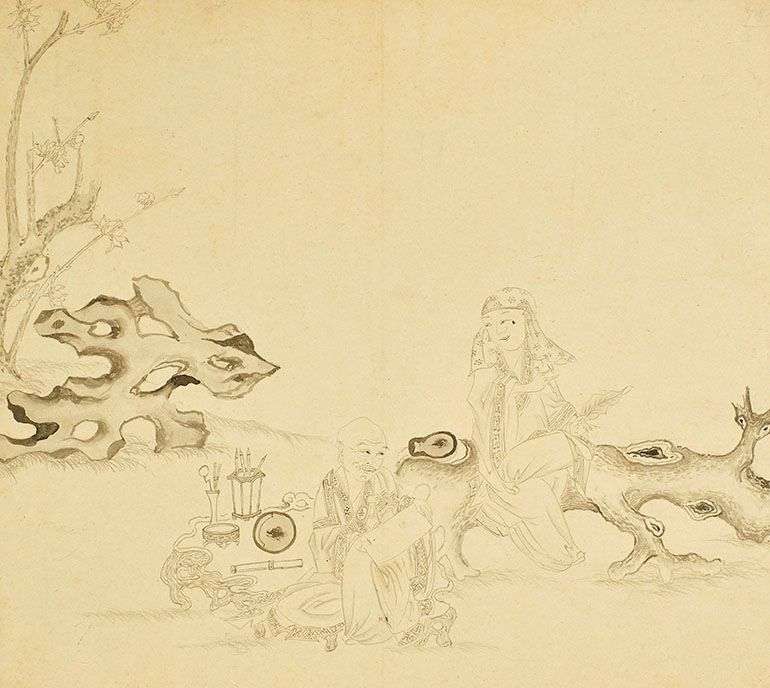 Ensemble de sept feuilles d'album à l'encre sur papier figurant des luohans dans des paysages montagneux.