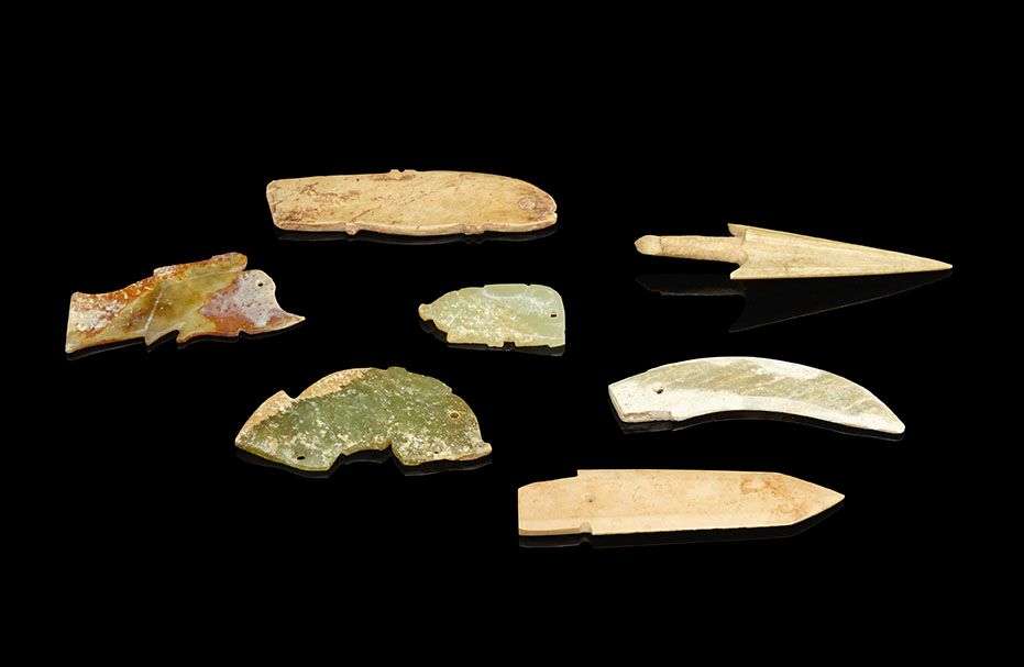 Ensemble de sept éléments variés (lames, poissons stylisés et tête de flèches) en jade calcifié et pierre dure sculptées.