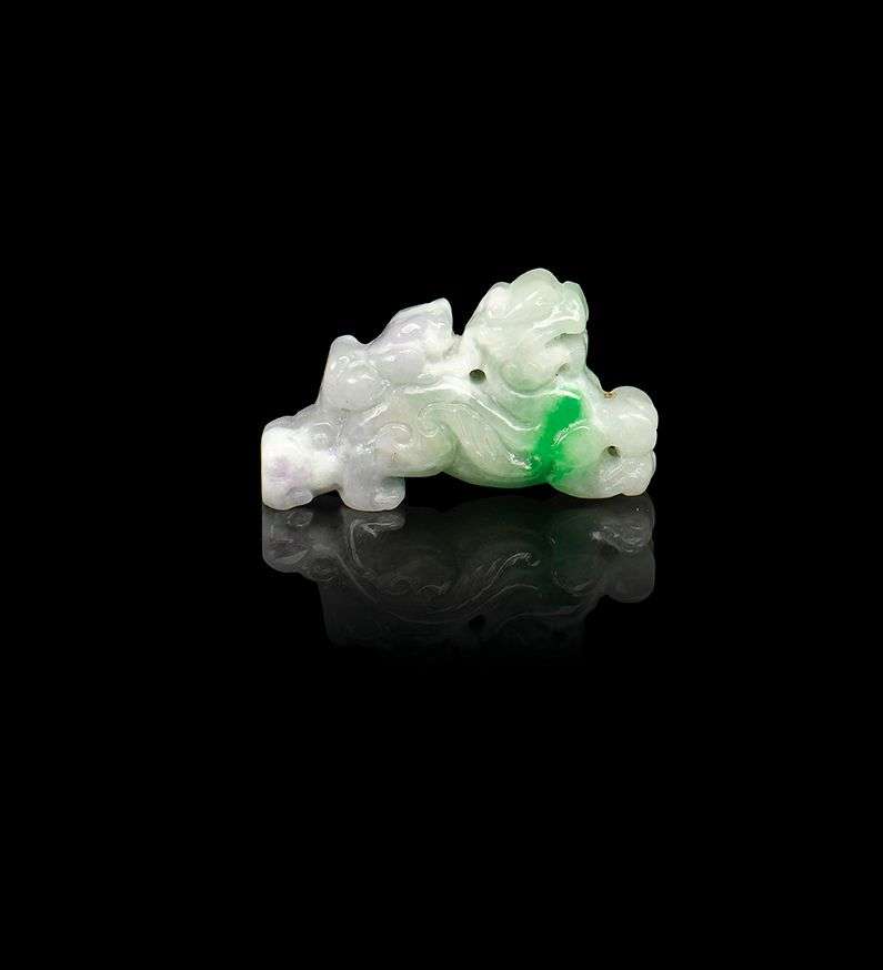 Petit sujet en jadéite sculptée figurant un pixiu. La pierre avec des inclusions vert pomme et lavande.