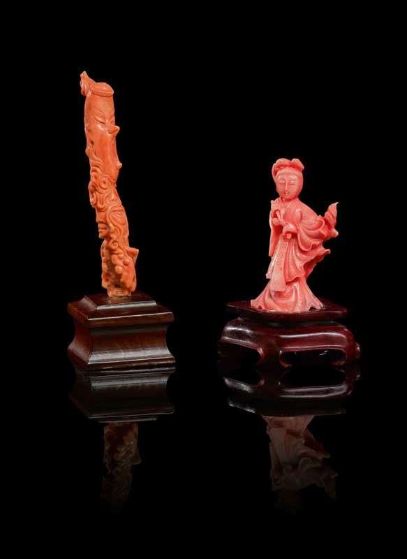 Statuette d'immortelle taoïste en corail rose sculpté et une branche de corail orange sculpté figurant des visages d'arhats.