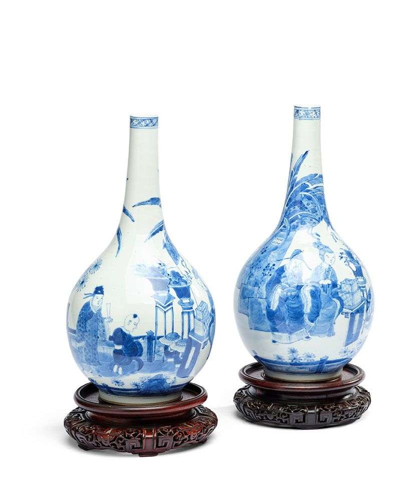 Paire de vases piriformes en porcelaine bleu-blanc à décor de personnages dans un jardin. Avec leur socle en bois naturel sculpté.