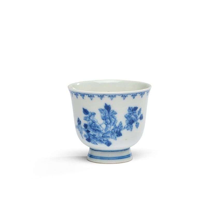 Petite tasse en porcelaine bleu-blanc à décor de pivoines. La base avec une marque Jiangxi